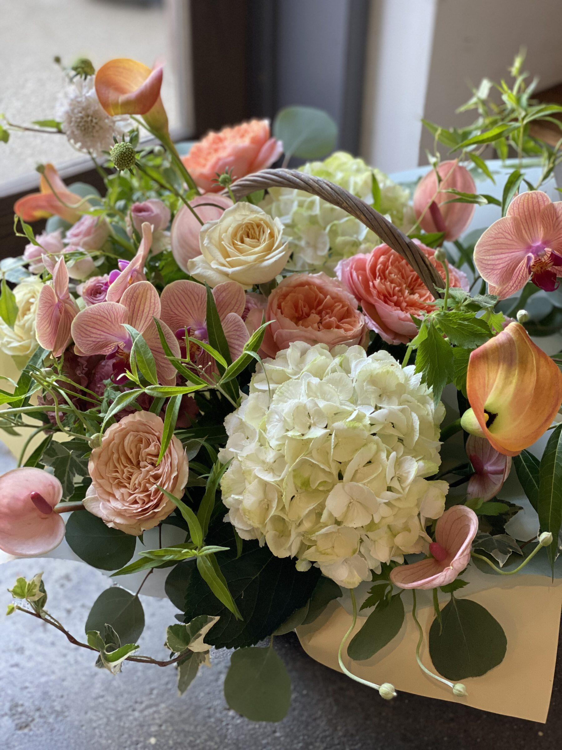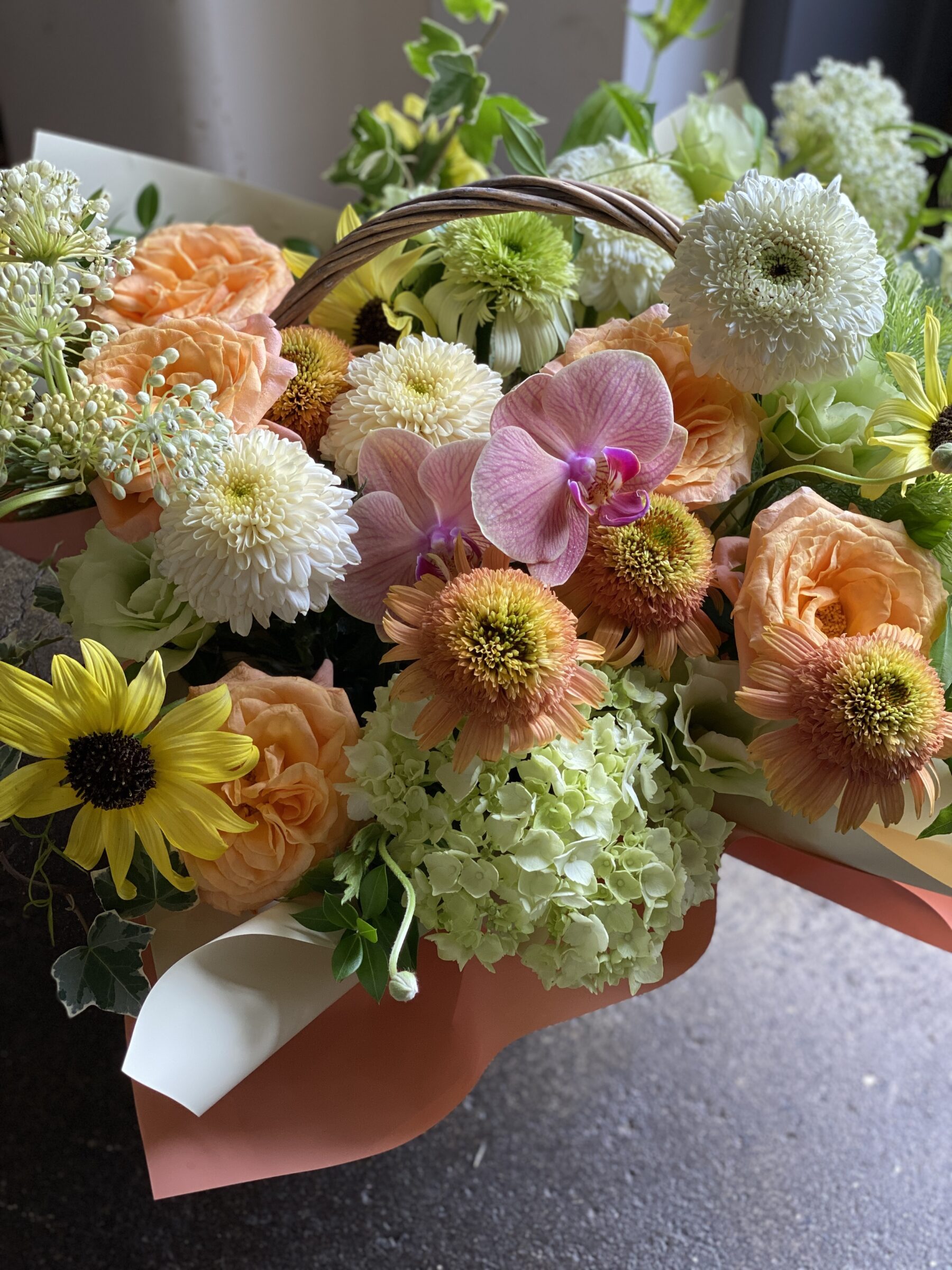 優しくかわいい印象のバスケットタイプのアレンジメントは