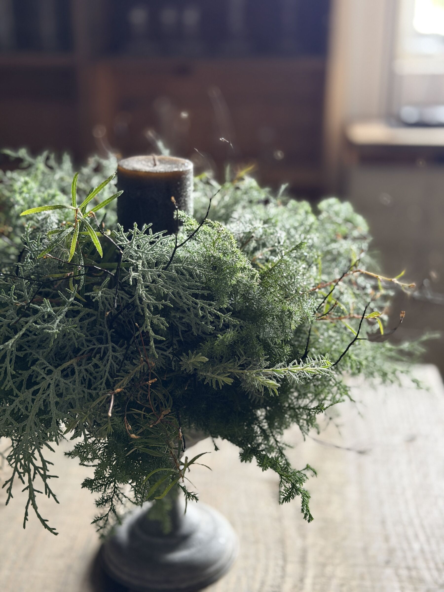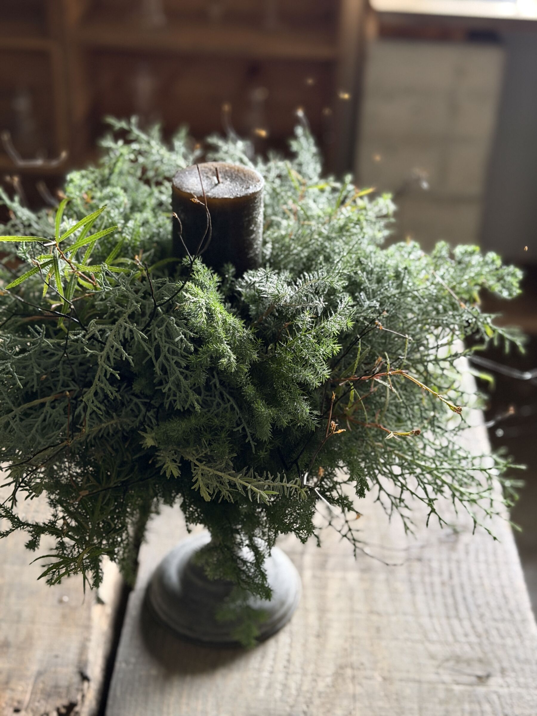 ナチュラルグリーンと大きめのキャンドルを飾ったアレンジメントです